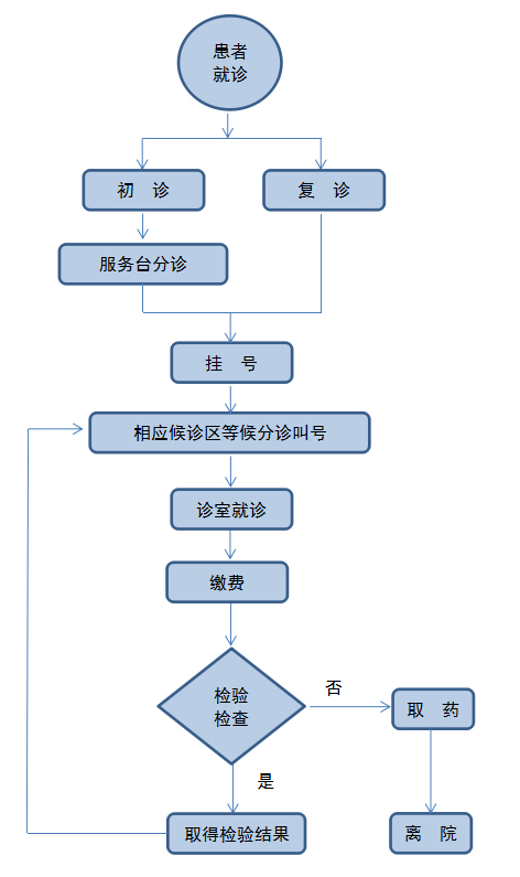 四、门诊就诊须知: 1、初诊患者请先至导医台分诊; 2、专家门诊可直接挂号; 3、挂号后凭挂号单显示序号,在候诊区等待电子显示屏呼叫就诊; 4、挂号后就诊当日有效,需复诊患者请于三日内至挂号处免费领取复诊号。 5、采血处位于门诊二楼大厅,多数采血检查项目要求空腹,请患者留意; 6、门诊一、二楼及医学影像科均设有检验检查报自助打印机,您可凭借检验检查申请单上二维码自助打印。 7、一楼大厅设有导医台,您在就诊过程中遇到任何困难和问题,可直接与导医台联系,他们必将热情为您服务。