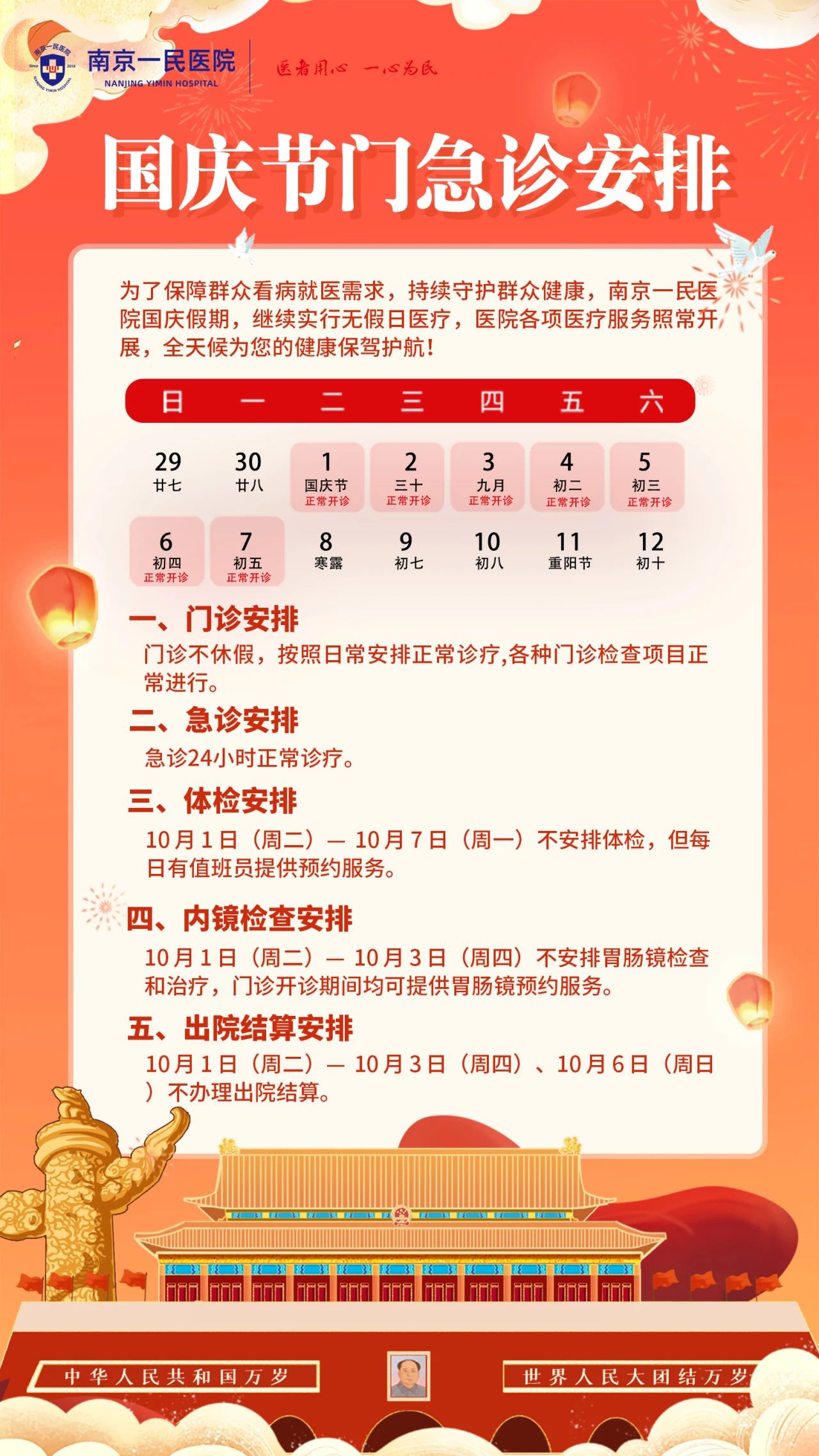 通知丨南京一民医院国庆节期间门急诊安排