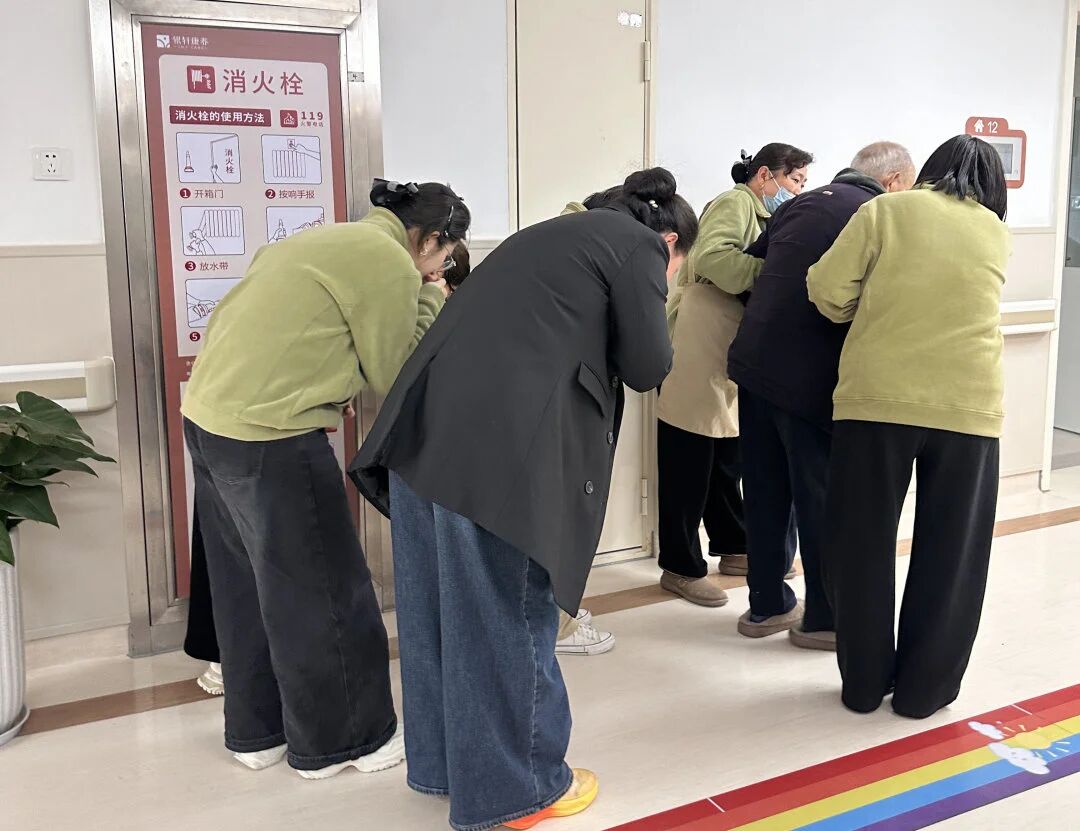 在器材实操环节,医院安全员现场示范灭火器“提、拔、握、压”四步操作法及消火栓规范使用流程,耐心细致地讲解每个动作的关键要点,并手把手指导养老机构员工及部分自理老人上手实操,确保人人懂操作、个个会处置,真正将消防知识转化为应急能力。