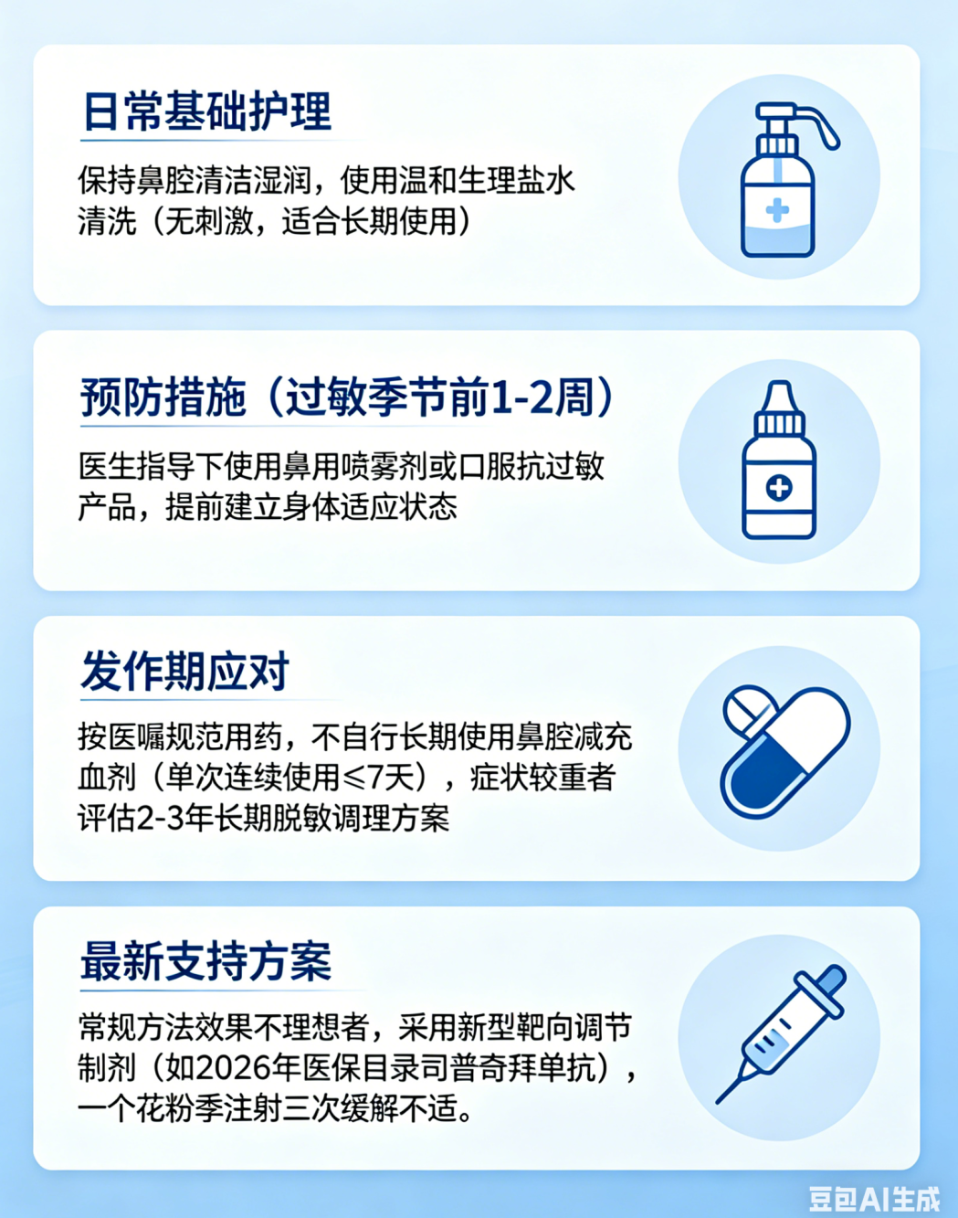 1.首选治疗:使用鼻用糖皮质激素喷雾剂,改善各类鼻部症状。