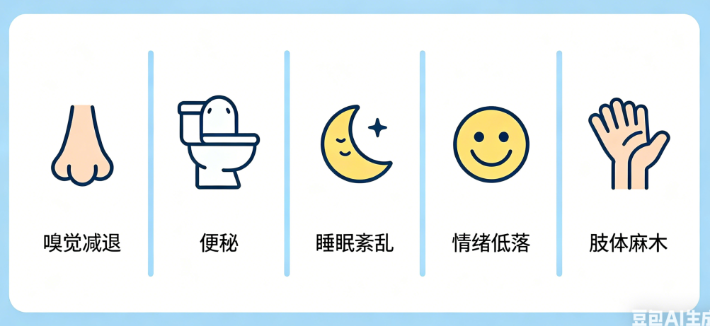 1. 感官与消化问题:嗅觉突然减退或消失(闻不到饭菜香、花香)、长期顽固性便秘、口干、吞咽困难;