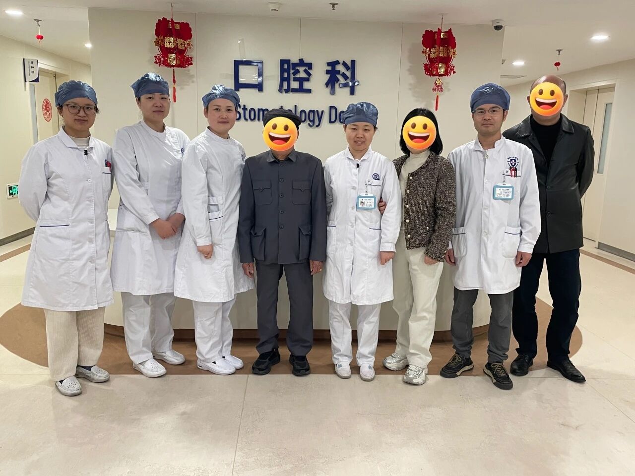 手术当天,凭借术前的充分准备,在两位主任的默契配合下,从拔除患牙到植入种植体,再到安装临时义齿,整个过程仅用两个多小时,创伤小、出血少,丁爷爷全程无明显不适。“手术一点都不痛,医生和护士都特别细心,就像家人一样照顾我。” 术后丁爷爷握着医护人员的手连连道谢并合影留念。