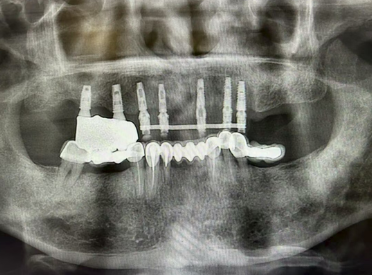 由于右侧种植体是数年前的老款,现在已经没有对应的复合基台,左侧又存在多颗烤瓷冠,丁爷爷的口腔情况较为复杂。为此,口腔科特邀请南京市第一医院医联体专家薛昌敖主任和宋鑫主任成立了专项诊疗小组,通过口腔CT仔细评估牙槽骨情况,反复研讨后制定了个性化修复方案:保留右侧原有种植体,调整匹配基台;左侧拆除烤瓷冠,拔除松动牙后即刻植入新的种植体,两侧同期制作临时义齿,实现“即拔、即种、即用” 的三重保障。