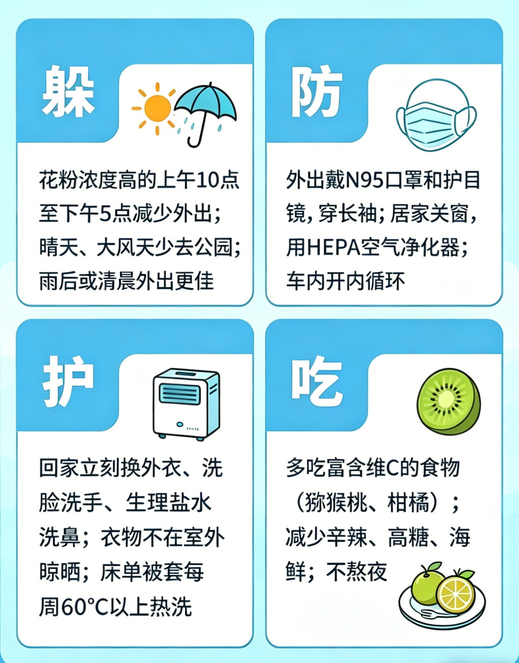 春季(3-5月)是花粉过敏高峰期,尤其是3月中旬至4月中旬。罪魁祸首并非鲜花,而是柏树、杨树、柳树、法国梧桐等树木的风媒花粉——颗粒小、数量大、随风飘散数公里,极易吸入引发过敏。