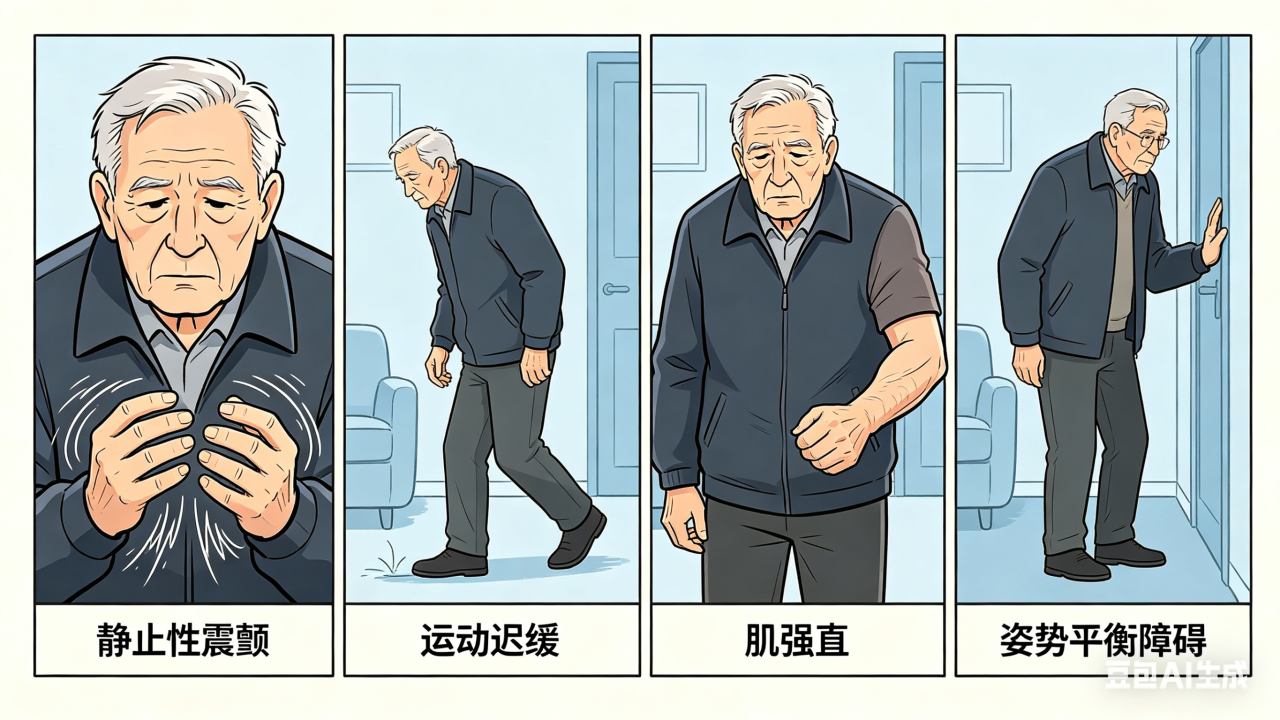 帕金森病是一种中老年人高发的神经退行性疾病,就像大脑里面负责调节运动、情绪、睡眠的“神经调节器”出了故障,导致身体出现一系列运动和非运动的异常表现。他不是遗传病,却有一定的家族遗传倾向,且发病率会随年龄增长逐渐升高,是影响老年人生活质量的常见疾病之一。核心表现为4点: